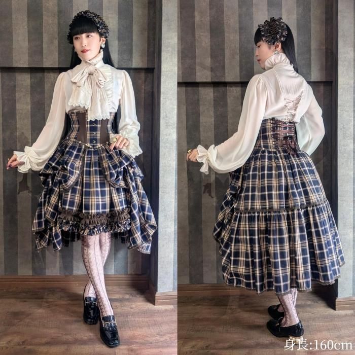 Plaid de Mémoire(プレイド・ドゥ・メモワール) 記憶の断片を織り重ねたようなクラシカルなチェックシリーズ。 懐かしさと気品をあわせ持つ柄は、日常にも特別なシーンにも寄り添います。 色ごとに異なる表情を映し出し、纏う人の記憶とともに深まっていくコレクションです。 生地をたっぷりと使用したオーバースカート。 巻きスカートとしても使えるようにウエストリボンは長めの仕様で 後ろ中心のベルトループにリボンを通してぐるっと巻くとずれずにお召しいただけます。